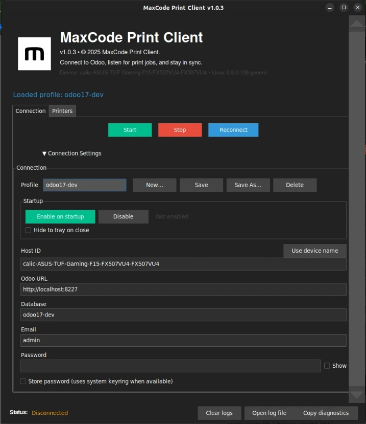 MaxCode Print Client desktop aplikacija — jednostavno postavljanje veze s podrškom za više profila. Radi na Windowsima i Linuxu.